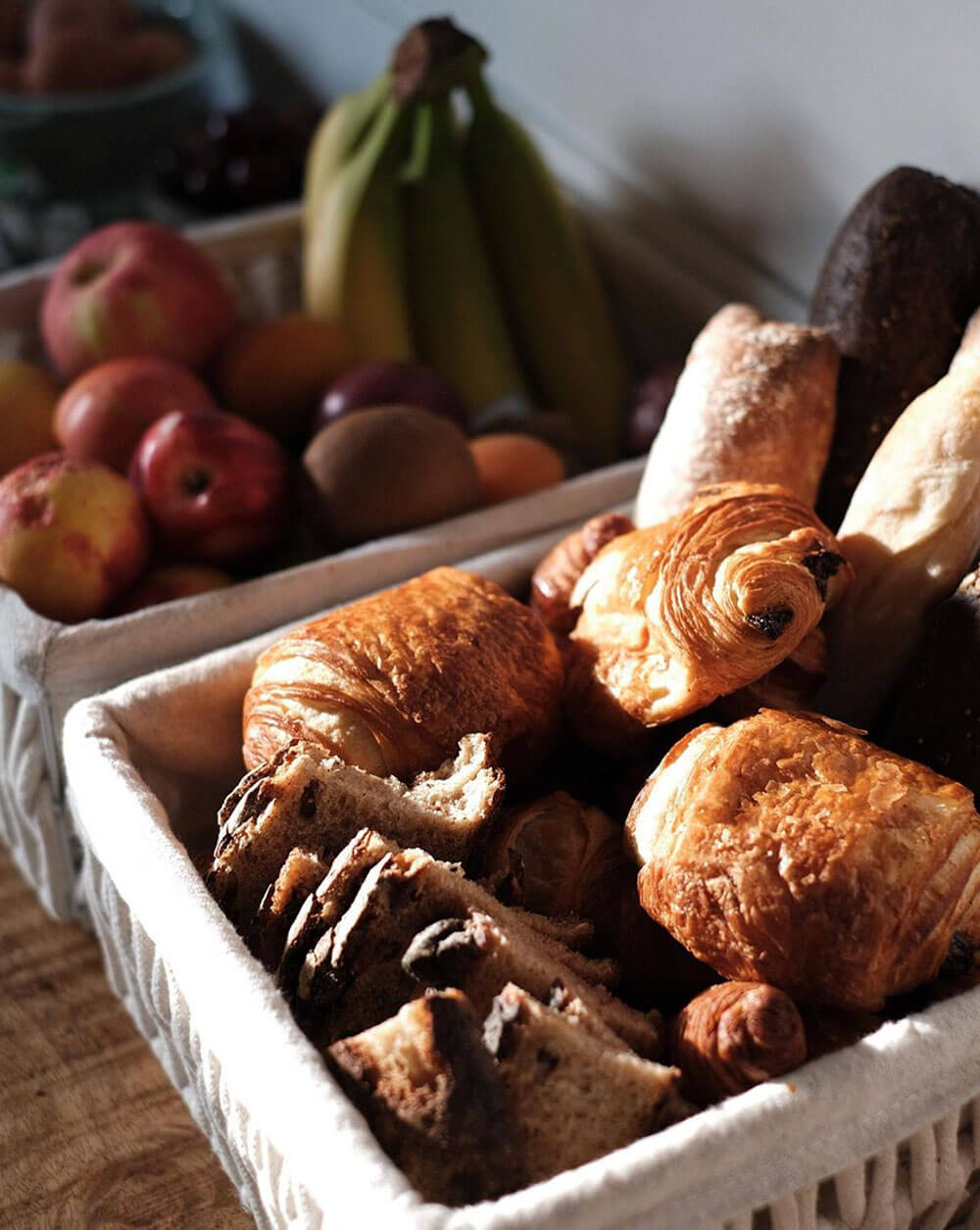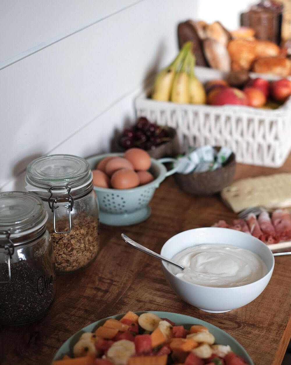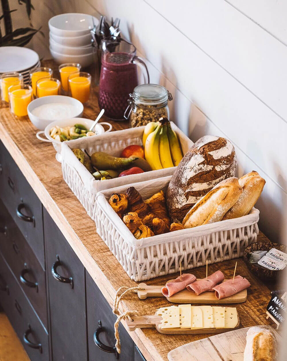 Des petits déjeuners complets sous forme de buffet : fruits, oeufs, fromage blanc, granola viennoiseries, pain, charcuterie, fromage, jus…